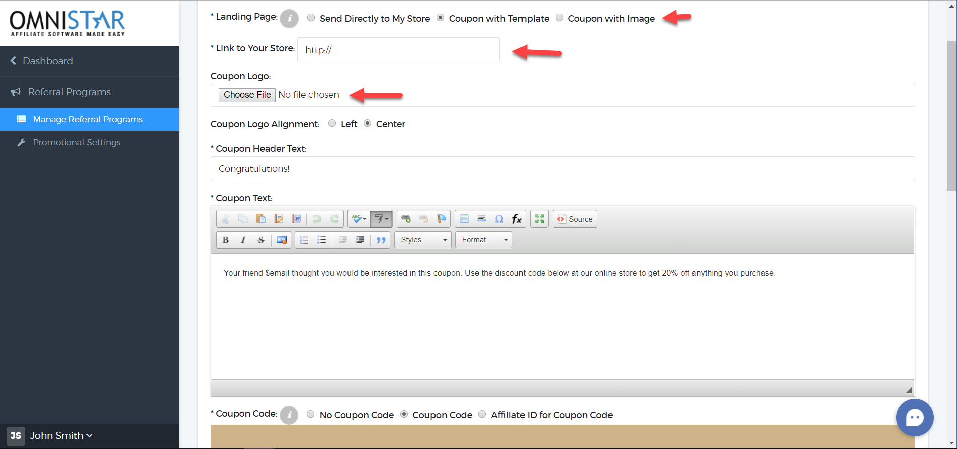4. In the following page, select the Landing Page option as "Coupon with Template" or "Coupon with Image" and fill details.